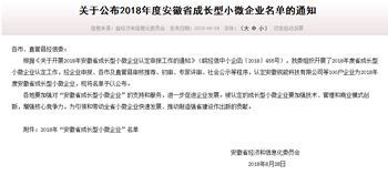 2018年8月29日,安徽省經(jīng)信委通過官網(wǎng)發(fā)布——2018年度安徽省成長型小微企業(yè)認(rèn)定名單,我公司安徽譽(yù)特雙節(jié)能技術(shù)有限公司喜獲認(rèn)定,為蕪湖市僅有的八家上榜企業(yè)之一,也是蕪湖國家級(jí)經(jīng)濟(jì)技術(shù)開發(fā)區(qū)和蕪湖高新技術(shù)創(chuàng)業(yè)園區(qū)唯一的入選企業(yè),含金量頗高。
