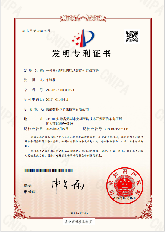 近期,我公司又一項發(fā)明專利獲得國家知識產權局授權,此項專利名稱為“一種蒸汽輪機的啟動裝置和啟動方法”,專利號:ZL 2019 1 0008 485.1 。