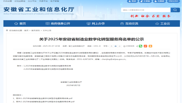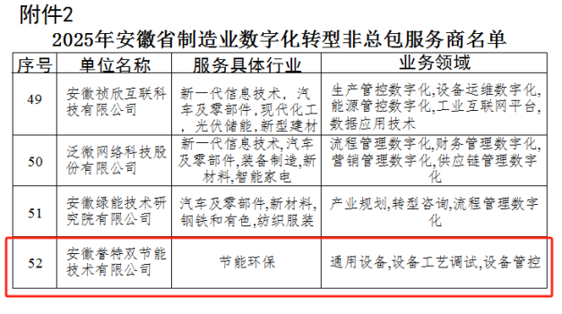 根據(jù)《安徽省工業(yè)和信息化廳關(guān)于公開征集2025年度制造業(yè)數(shù)字化轉(zhuǎn)型服務(wù)商的通知》,經(jīng)各服務(wù)商提交申報材料、專家評審等程序,省工信廳最終確定發(fā)布203家服務(wù)商,我公司名列榜單,在此表示熱烈祝賀!